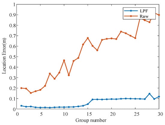 Comparison of baseline localization errors between low-frequency and raw images. The line graph plots the error obtained by comparing the registration localization with the actual localization for 30 sets of data using the baseline. The blue line in the figure indicates the localization error of the low-frequency image registration, and the red line indicates the localization error of the raw image registration.