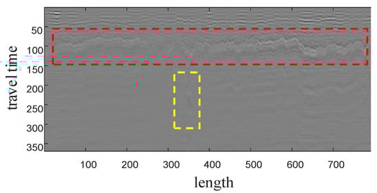 Typical GPR image. The red box region in the image has a clear black-white layering, demonstrating the layered characteristics of the GPR image, caused by the different dielectric constants of different geological layers. The yellow box region in the image demonstrates the hyperbolic feature of the subsurface target reacting to the image.