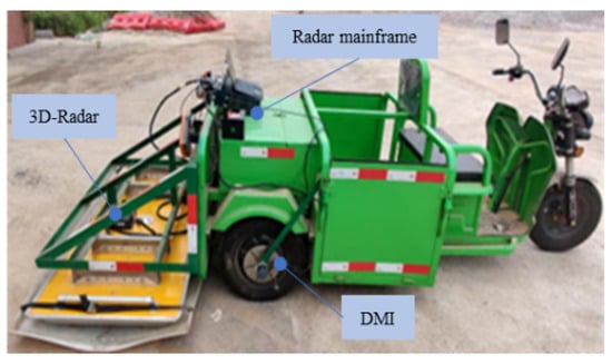 In this section, we evaluate the network’s performance through experimental validation and compare it with the baseline. To perform a comprehensive evaluation of the proposed method, we performed multiple sets of experimental data acquisition in different outdoor scenarios, containing various conditions such as different times and weather. The system platform used for data acquisition is shown in Figure 9, mainly including 3D-Radar, distance measuring instrument (DMI), a vehicle-mounted platform, a real-time kinematic (RTK) and a high-performance computer. The detailed parameter settings of the system are shown in Table 2. The experimental site was selected at the Yuntang campus of Changsha University of Technology, and the collected data are shown in Figure 10.