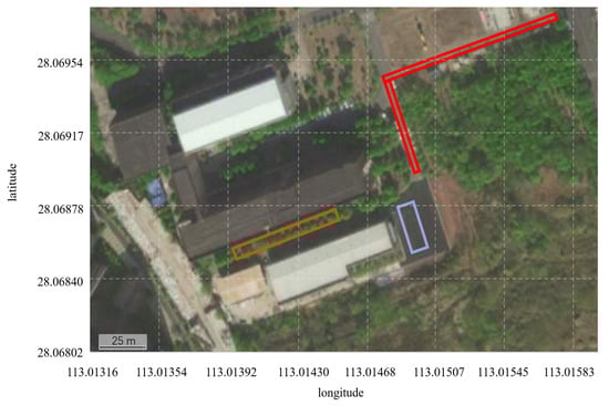 Actual measurement data recording section schematic. Among them, the red, yellow, and blue boxes represent asphalt, masonry, and cement road sections, respectively.