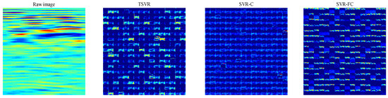 Three networks that can extract individual D-scan feature maps, TSVR, SVR-C, and SVR-FC, are selected to visualize the effect of feature map extraction. The feature images before extracting the conv3 of these three networks are shown in Figure 11. We find that the SVR-C network, which does not incorporate the attention mechanism, learns features with low differentiation, and the features are fuzzy and similar to each other. The SVR-FC network utilizes shallower and less stable information in the subsurface, not conducive to achieving robust registration and localization. The TSVR extracts features from a wider distribution area, including the upper-medium stratification information and the deeper robust information. TSVR gives different weights to different spatial regions and feature maps, showing a more favourable effect on feature extraction for registration and localization.
