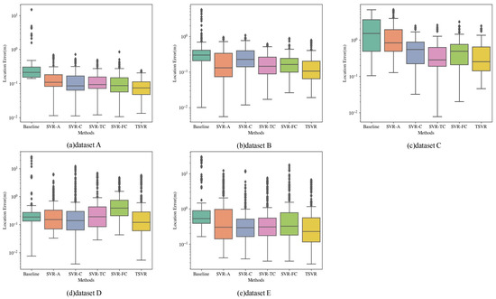 Comparison of the localization errors under different localization methods. The results of comparing the localization errors of different methods on five datasets are shown in the figure. Each boxplot shows the six methods, baseline, SVR-A, SVR-C, SVR-TC, SVR-FC, and TSVR, from left to right. The statistical results for each method contain a median value line, a coloured box, upper and lower boundary horizontal lines, and several diamond-shaped discrete points. The horizontal line in the coloured box indicates the median value of the localization error. The upper and lower boundaries of the box indicate the 25th and 75th percentile, respectively, and the upper and lower black boundary transversals indicate the maximum and minimum errors after removing the discrete values, respectively. A cross-sectional comparison of each boxplot demonstrates the localization performance of different methods.