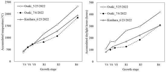 Figure 5 shows the accumulated air temperature and accumulated daylight hours for the years and regions for which the test data were obtained. Each test data set showed a different trend of accumulated air temperature and accumulated daylight hours. Accumulated temperatures were similar in all three plots until V8, after which the 25 May sowing in Osaki City had the highest accumulated temperatures. The 6 July sowing in Osaki City had lower accumulated temperatures from V8 to R1 than the other two plots, and the accumulated temperature at R6 was also lower. Kurihara City was in the middle of the other two plots until R3, but the difference with Osaki City’s 6 July sowing became smaller at R6. The accumulated daylight hours from V4 to R6 were highest for the 25 May sowing in Osaki City. Sowing on 6 July in Osaki City had the least accumulated daylight hours from V8 to R1 and the least accumulated daylight hours to R3, but at R6, the accumulated daylight hours were equal to those in Kurihara City.