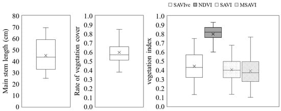 The minimum value of the measured main stem length was 24.9 cm, the maximum value was 69.4 cm, and the mean value was 45.0 cm (Figure 8). The minimum value for vegetation cover was 0.38, the maximum value was 0.85, and the mean value was 0.60. The minimum value for each vegetation index was 0.13 for SAVIvc, 0.60 for NDVI, 0.13 for SAVI, and 0.10 for MSAVI. The maximum values were 0.75 for SAVIvc, 0.93 for NDVI, 0.68 for SAVI, and 0.77 for MSAVI. The mean values were 0.44 for SAVIvc, 0.80 for NDVI, 0.41 for SAVI, and 0.39 for MSAVI. The maximum and minimum vegetation index values were higher for NDVI than for the soil-adjusted vegetation indices SAVIvc, SAVI, and MSAVI. When compared among the soil-adjusted vegetation indices, SAVI had the lowest maximum value, and the distribution of MSAVI tended to be skewed toward the lower values.