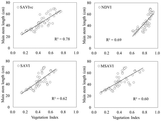 Relationship between vegetation index and the main stem length. Circles indicate the measured data, and lines indicate the linear regressions.