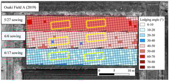 Results of lodging prediction using the areal lodging prediction method. This figure shows field A in 2019. The yellow box in the figure indicates research sites.