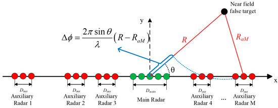 As for distributed array radar, its equivalent aperture can reach over several hundred meters. As a result, the distance from the signal source to the phase center of each unit array differs considerably, and the time delay from the target to a different unit array cannot be ignored. This time delay difference may lead to a signal amplitude envelope error and a phase error. Although the amplitude envelope can be corrected by time–frequency synchronization, the phase error in the steering vector model cannot be neglected. Thus, the signal model of the distributed array cannot be simply equivalent to the plane wave model. In this paper, the near-field spherical wave model is employed to revise the steering vector of the original far-field model. The spherical wave model is chosen instead of the Fresnel model mentioned in [15,16] because the Fresnel model is an approximate model of the spherical wave model after Taylor expansion. If the target’s position falls outside the range , the accuracy of the model decreases, resulting in performance degradation. As shown in Figure 2, assume that Rmain is the distance between the phase center of the main array and the signal source, and Rai (i = 1, …, M) is the distance between the phase center of each auxiliary array and the signal source. According to the cosine theorem, the distance between each unit array can be expressed as