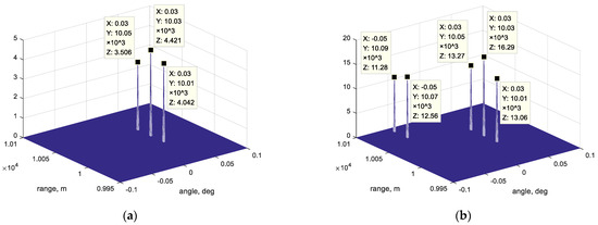The initial values for iteration are set to the target range and angle at the previous pulse repetition time (PRT) before the distributed radar receives jamming during the tracking process. The estimated target peak () in the PC result after jamming suppression is used to modify . The angle value is obtained by traversing within a certain range around the initial angle and selecting the angle value with the smallest target loss. Through iteration, the target position can be updated until the number of cycle iterations reaches the limit or the signal loss reaches the minimum.