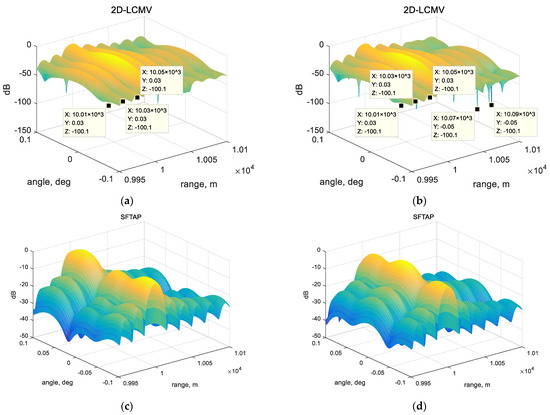 Range-angle joint beam pattern of (a) the proposed method in a single-jamming situation, (b) the proposed method in a two-jamming situation, (c) SFTAP in a single-jamming situation, and (d) SFTAP in a two-jamming situation.