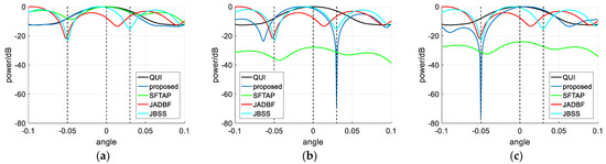 Beam patterns of the proposed method and comparison methods in a two-jamming situation: (a) at the target range unit; (b) at the jamming range unit corresponding to 0.03°; (c) at the jamming range unit corresponding to −0.05°.