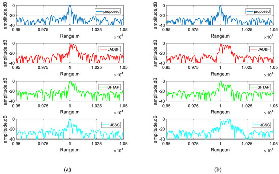 Pulse compression results of the proposed method and comparison methods: (a) in a single-jamming situation; (b) in a two-jamming situation.