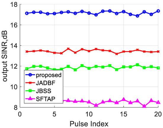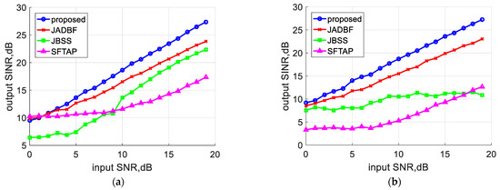 For further comparison of the performance of the proposed method and other methods, the output signal-interference-to-noise ratio (SINR) versus input signal-to-noise ratio (SNR) of the proposed method, SFTAP, JADBF, and JBSS are shown in Figure 9. It is found that the output SINR of the proposed method is better than the output SINR of SFTAP, JADBF, and JBSS. This is because the proposed method achieves lower target loss and less jamming residual compared with other methods.