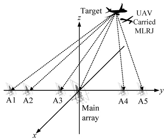 Large-aperture distributed array radar consists of one main array and several independent receiving auxiliary arrays, which are connected to an operation center and work cooperatively [20]. In this paper, one main array with a large aperture in meters and M auxiliary receiving arrays with smaller apertures are arranged to form the distributed array radar, as shown in Figure 1. The phase-center positions of each array are optimized by an adaptive genetic distributed radar node position optimization algorithm [21], which can suppress the grating lobe and maintain the equivalent mainlobe width. In the following description, we refer to a single main array or auxiliary array as a unit array.