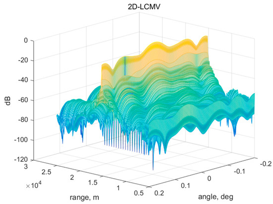 After using the modified weighted vector, a series of nulls at the joint range-angle positions of false targets is formed. As a result, the false targets caused by DRFM repeater jamming can be suppressed. The LCMV weight vector is applied to the data vector of the distributed array received echo, and the output result pointing to the target position can be obtained.