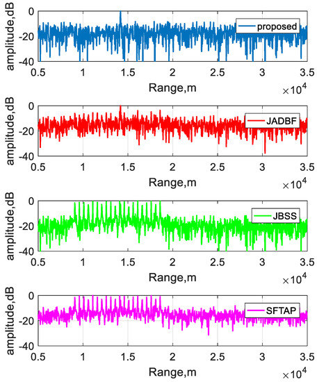 The pulse compression results of the proposed method, JADBF, SFTAP, and JBSS are shown in Figure 8. It can be seen that the target PC peak of the proposed method can be accurately detected. On the other hand, the comparison methods suffer from serious jamming residuals, and the target PC peak is difficult to accurately detect. It can also be seen that in the two-jamming situation, the peaks caused by jamming residuals in the comparison methods are more numerous and higher in amplitude. In particular, the JBSS method shows much worse performance because of the misjudgment of the target channel after the separation of the target and jamming channel.
