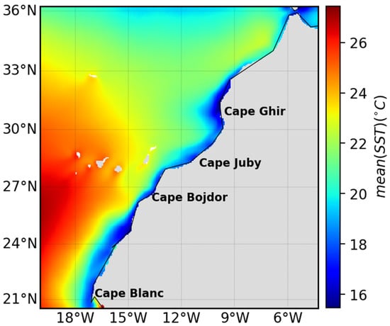 Our research focuses on the Moroccan Atlantic coast, which stretches from N to N and W to W, where upwelling fluctuation is high and diverse throughout the year []. This region is illustrated in Figure 1 together with a climatological image of SST in the same area. The SST data are derived from the Group for High-Resolution Sea Surface Temperature (GHRSST) multi-product satellite-based ensemble (GMPE), which is publicly available on the climate data store website https://cds.climate.copernicus.eu/ (accessed on 29 May 2022) Figure 1. This dataset provides daily estimates of global sea surface temperature based on observations from multiple satellite sensors. The images used in this work were obtained by averaging the data from the previous eight days. We considered eight-day images because they allowed us to limit the number of pixels affected by clouds and to reduce the computational load by processing fewer images per day. In addition, this approach helped us balance the variability of pixel values and the need for continuous spatio-temporal coverage [,].