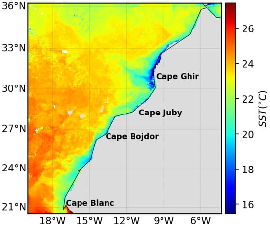 In addition to wind patterns, sea surface temperature (SST) and nutrient-rich water in coastal areas serve as important indicators for determining the intensity of upwelling. SST images provide an overview of the surface ocean skin temperature distribution within the top few micrometers of the surface layer [].
