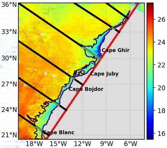 The method described in [] is primarily based on the Ekman theory, which is the main driver of the upwelling phenomenon. As described in [], the movement of surface water to the right of the wind direction, caused by Ekman transport, can result in coastal upwelling in certain regions such as the northwest African margin. Therefore, to detect the occurrence of upwelling, it is common practice to compare the temperature of coastal water with offshore water. To incorporate this information into the preprocessing stage, a meridional normalization of SST images was proposed in []. This normalization involves dividing the image into perpendicular lines along the coastline (the black line in Figure 3) and comparing the temperature of coastal water with offshore water. Each line was normalized by dividing its temperature pixels by the maximal temperature observed in the offshore region. This normalization step improved the identification of upwelling areas and preserved the thermal structures of the original SST image. Additionally, a moving average algorithm was applied to mitigate fluctuations in the vector of maximal temperatures. The resulting normalized image (Figure 4a) exhibited clear distinctions between offshore and coastal information, enhancing the visualization and analysis of upwelling.