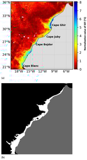 For example, authors in [,,,,] used the remote sensing data of SST to calculate the upwelling index to characterize the main patterns of seasonal and interannual upwelling variation. For instance, this index is computed as a simple thermal difference between warmer offshore waters and cold coastal waters at the same latitude over the northwest African upwelling area.