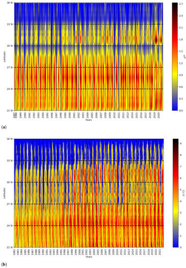 We can see that the years 1995–1996, 1998–2009, and 2012–2021 have significant vertical velocity transport, corresponding to stronger periods in the records. These pronounced anomalies are linked to the collapse of the regional sardine stock between 1996 and 1997 and a very low number of juveniles in 1996 and 1998 [] ( Figure 8a and Figure 9). Conversely, some years show abnormally low yields (Figure 8a). The years 1983 to 1994 and 2010 to 2011 stand out as periods of weaker upwelling intensity with exceptionally low winds (Figure 8b). In addition, a distinct zone of very weak upwelling is identified between N and N during the years 1996 to 1997 and 2010 to 2011. This weak upwelling is attributed to an exceptional easing of the trade winds during these periods, as shown by Ekman’s cross-shore transport data (Figure 8b) [].