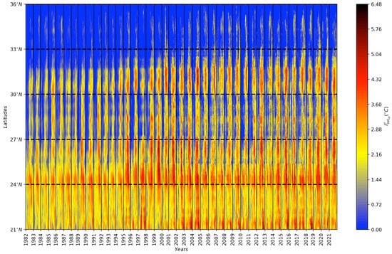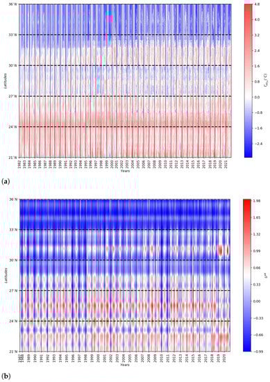 where and are, respectively, the maximal offshore and minimal inshore temperatures. The results of the upwelling index developed in [] () from SST are shown via a space–time Hövmoller diagram over the period between 1982 and 2021 (Figure 5b).
