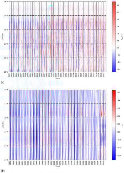 A more detailed space–time Hövmoller diagram of spatial and temporal anomalies from 1982 to 2021 is presented in Figure 7 and Figure 8.