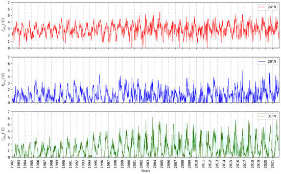 To better study upwelling activity, we present our new upwelling index at three sites ( N, N, and N). Figure 9 displays the interannual variations in the upwelling activity at the three selected sites mentioned above from 1982 to 2021. Based on these results, we observe that the three latitudes follow a general trend during each year that the maximum activity peaks are recorded.