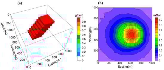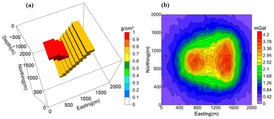 To verify the validity of the suggested β and p values, we inverted the gravity data produced by the model consisting of two dipping dykes (Figure 6a). The data set (Figure 6b) covers a 41 × 21 grid of 50 m and 100 m spacing along easting and northing, respectively. It is contaminated by uncorrelated Gaussian noise whose standard deviation is equal to 2% of the accurate datum magnitude plus 0.05 mGal. The densities of the east and west dykes are 0.8 and 1 g/cm3, respectively. The corresponding model region is divided into 40 × 40 × 30 cubes of 50 m on each side.