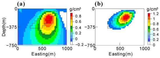 Figure 11a,b display slices produced by the unconstrained l2-norm inversion. The maximum value of the recovered density distribution is about 0.2 g/cm3, which is much lower than the value of the true density contrast (1.2 g/cm3). The recovered model also possesses a broader range of vertical extension compared with the known ore body. Figure 11c,d presents the results of the unconstrained lp-norm inversion with p = 1.05 and β = 0.9. The maximum value of recovered density distribution is about 0.8 g/cm3, which is closer to the value of the true density contrast (1.2 g/cm3). The vertical extension of the model is also in good agreement with that of the known ore body. In addition, both models failed to recover the tail of the ore body. Numerical tests show that this is mainly because the gravity response of the tail is canceled by the response of the adjacent negative source.