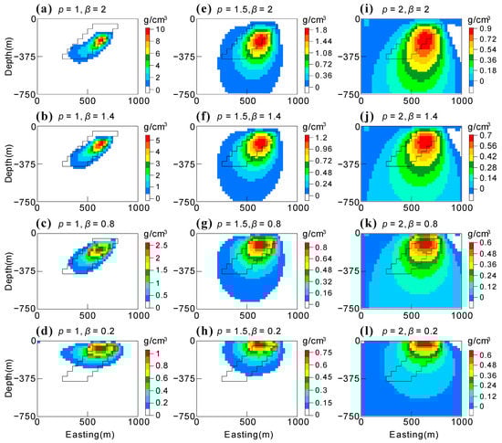 To choose proper β and p values for the artifact-free inversion of gravity data, we need to understand the effect of the depth-weighting function and lp-norm minimization on the inversion results. We used different combinations of β and p values (β values range from 0.2 to 2, with an interval of 0.2; p values range from 1 to 2, with an interval of 0.1) to perform 110 inversions of the gravity anomaly (Figure 1b) generated by the aforementioned dipping slab model (Figure 1a). Due to space limitations, we only show 12 inversion results, with combinations of β = (0.2, 0.8, 1.4, 2) and p = (1, 1.5, 2), in Figure 3.