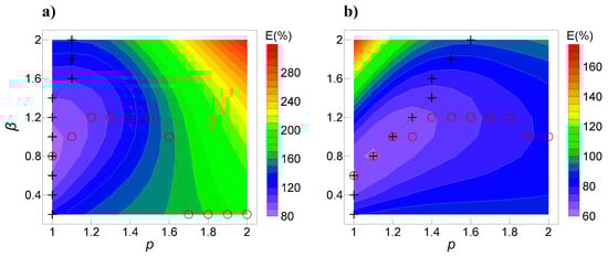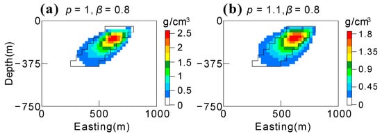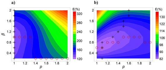 where mr and mt represent the recovered model and the true one, respectively. Figure 4a,b show the recovered errors of the dipping dyke model with all 110 combinations of β and p values using Equations (11) and (12), respectively.