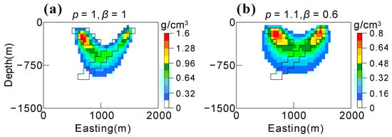 We carried out two inversions for the gravity anomalies in Figure 10b using an unconstrained l2-norm inversion and lp-norm inversion with p = 1.05 and β = 0.9, respectively. The model region was discretized into 100 × 60 × 32 cubes of 10 m on each side. The noise of each datum was assumed to be equal to 2% of its magnitude plus 0.004 mGal.