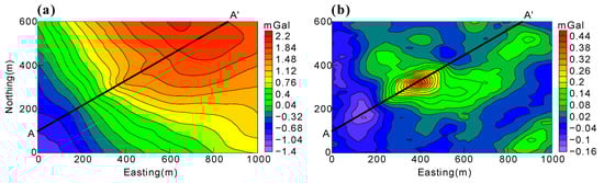Figure 10a shows the Bouguer gravity anomaly of the deposit, which is gridded into a 101 × 61 grid of 10 m spacing and covers a region of 0.6 km2. In Figure 10a, we can see that the Bouguer anomaly mainly reflects the long wavelength information and contains little information regarding the shallow surface. To extract the local gravity anomaly produced by the ore body located in the shallow surface, we separated the Bouguer anomaly using an inversion-based method. The subsurface was first divided into 20 × 20 × 20 cells to a depth of 640 m. Using lp-norm inversion with p = 1.05 and β = 0.9, we obtained the density distribution within these cells. The regional anomaly was determined by forward modelling of the cells located at depths below 100 m. The residual anomaly (Figure 10b) used to perform the following inversions was calculated by subtracting the regional anomaly from the Bouguer anomaly.