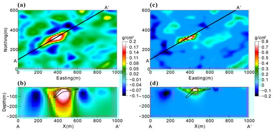 Plan sections at depth = 45 m and cross-sections of AA′ through the models, achieved by inverting the gravity data in Figure 10b using (a,b) unconstrained l2-norm inversion and (c,d) lp-norm inversion with p = 1.05 and β = 0.9. The black lines in (b,d) indicate the positions of the ore body.