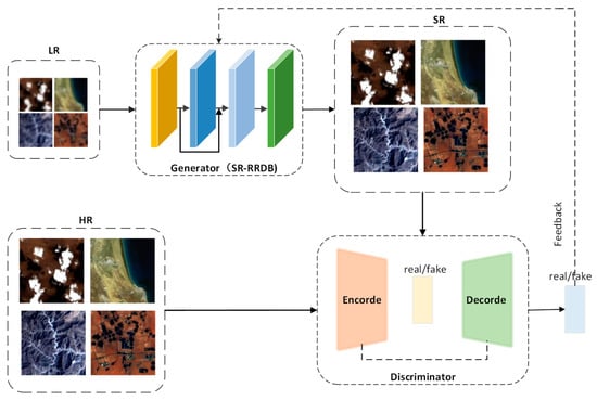The last module consists of two regular modules where the convolution kernel is changed from 1 × 1 to 3 × 3 to enlarge the perceptual field and to learn features better. With the above generator network structure, called SR-RRDB, a high-resolution image corresponding to the input image is reconstructed.