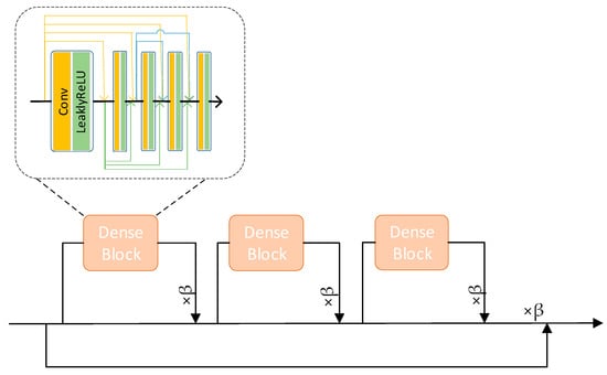 The second module consists of 23 Residual-in-Residual Dense Block (RRDB) modules and a regular module with residual network connections. Among them, the RRDB combines the residual network structure and dense connectivity as shown in Figure 3. The residual network learns the residuals between the input and output, and most of the residuals can be 0 or smaller []. The dense connection is defined as , where  denotes the network that combines  layer-generated feature map connections as input []. Residual networks reuse features but are not good at mining new features while dense connections constantly explore new features but lead to higher redundancy []. RRDB combines the advantages of both network structures to make the model better adapted to complex data distributions and patterns, improving performance and accuracy.