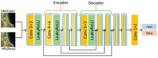 In this study, instead of using the traditional discriminator structure, we chose a discriminator network based on the U-Net structure, as shown in Figure 4. This discriminator network structure consists of two main components: an encoder (down-sampling) and a decoder (up-sampling). The encoder is responsible for capturing the contextual information in the image, while the decoder is responsible for recovering the image details. To achieve information fusion, a jump connection is used between the two. As a result, this approach demonstrates its effectiveness in extracting multi-scale features from images with improved efficiency and accuracy.