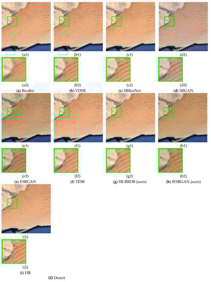 Visual comparison of our method with different SR methods on the test set. (1) Denseresidential; (2) Desert. (a) Bicubic result, (a2) is an enlarged view of the green area on (a1); (b) VDSR result, (b2) is an enlarged view of the green area on (b1); (c) SRResNet result, (c2) is an enlarged view of the green area on (c1); (d) SRGAN result, (d2) is an enlarged view of the green area on (d1); (e) ESRGAN result, (e2) is an enlarged view of the green area on (e1); (f) TESR result, (f2) is an enlarged view of the green area on (f1); (g) SR-RRDB (ours) result, (a2) is an enlarged view of the green area on (a1); (h) IESRGAN (ours) result (h2) is an enlarged view of the green area on (h1); (i) HR image, (i2) is an enlarged view of the green area on (i1).