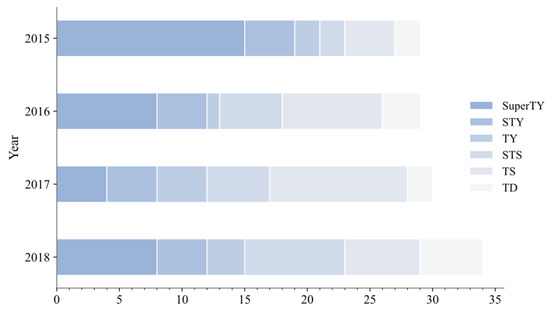 Figure 1 shows the information on the TCs which occurred over the western North Pacific from 2015 to 2018, respectively, recorded with the CMA-BST data. A total of 117 TCs were active over the western North Pacific Ocean, including nine TDs, twenty-seven TSs, fourteen STSs, nine TYs, sixteen STYs, and four SuperTYs, respectively. In addition, since the temporal resolutions of the CMA-BST and the satellite data are 6 h and 1 h, respectively, this paper constructed an original dataset and an interpolated dataset to maximize the use of the existing data while ensuring the accuracy of the data. The original dataset was composed of all the time nodes in the satellite data corresponding to the time series of the CMA-BST, and the final temporal resolution was 6 h. The interpolated dataset was constructed through linear interpolation of the CMA best-track (6-h interval) based on the time-series of satellite data (1 h interval), and the final temporal resolution was 1 h.