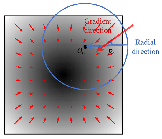 Schematic of the deviation angle calculation process with the brightness temperature image of an ideal vortex (shaded) and gradient vectors (red).