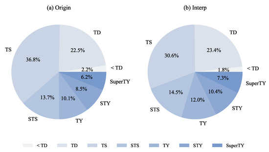 Following the IR cloud image transformation and factors calculation, 2342 samples were obtained from the original dataset, while 13,471 samples were retrieved from hourly interpolations, respectively. Figure 4 shows the proportion of samples at different TC intensity levels for the original and interpolation dataset, respectively. For the original data, approximately 75% of the TC samples were weaker than the TY, most of which were at the levels of TS and TD, respectively. For the interpolated data, due to the reduction in the time intervals for TC intensity classification, the proportion of high intensity levels above TY was found to have increased, accounting for approximately 30% of all data.