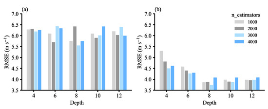 Figure 5 shows the RMSE of the CatBoost models constructed based on the original data and interpolation data under different hyperparameter schemes. In general, the RMSE showed a trend of decreasing sharply initially and then increasing slowly with depth and n_estimators, indicating that the optimal hyperparameter needs to be a medium value which can control the error without overfitting. In addition, using the interpolation dataset, the RMSE can be reduced to about a third of those with the original dataset, which indicates that improving the temporal resolution of the best-track data and expanding the overall dataset can improve the model’s performance. With either of these two datasets, an n_estimators value of three thousand and a depth of eight was found to give the best results.