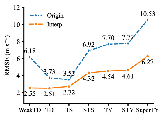 RMSE of the CatBoost-based model for tropical cyclones (TCs) of different intensity levels with the original dataset (blue dashed line) and the interpolated dataset (orange solid line).