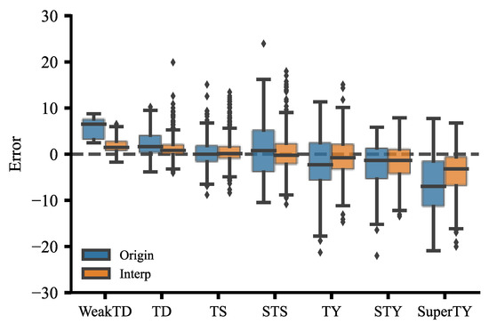 Figure 8 shows the distribution of deviations of the CatBoost-based model results from the CMA-BST data at different levels of TC intensity. The median intensity deviation of the model was close to the zero-value line at the levels of TD, TS, and STS. The deviation observed was clearly positive at low-intensity levels, while markedly negative at levels above TY. Overall, this CatBoost-based model appears to have the problem of overestimating at low intensities and underestimating at high intensities. Furthermore, the boxes obtained using the model trained on the original data deviated more in length (spread) and position than those obtained with the model trained on the interpolated data, which further shows that using the interpolated data to train the model can reduce the deviation and variance of the model and thereby improve the accuracy of the model.