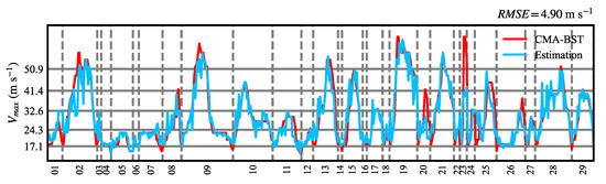 According to the CMA-best-track data, there are 29 named TCs developed in the WNP in 2019 with a total of 529 times. Figure 9 shows the validation results of all 29 named TCs in 2019. The intensities of most cases are well replicated except for the No. 20 and No. 23 cases. These two cases both showed rapid intensification and rapid weakening, with their strongest intensity lasting for a very short time. Therefore, it is rather difficult for the model to capture the intensity of these two TCs. The total RMSE was 4.90 m s−1, which was still deemed to be competitive compared with other models, indicating that our model is robust and can be generalized to estimate the intensity for future TCs.
