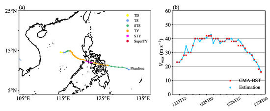 (a) Track and intensity of Phanfone. (b) Time series of its intensity, as predicted using the model (blue) and as recorded in CMA-BST (red). The study time was 1223 UTC 12-1228 UTC 03, and the temporal resolution was 3 h. The case was affected by the cold air and therefore weakened and disappeared in the center of the South China Sea.