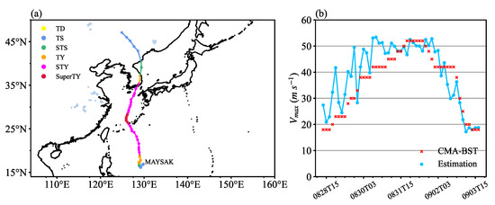 Maysak was one of the strongest typhoons in 2020, with another typical northward track, and which later turned into an extratropical cyclone. Figure 11 shows the basic evolution of Maysak and compares the model detecting results and the CMA-BST data. The intensity prediction error of the model for Maysak was 5.66 m s−1, which indicates that the model also exhibits a good intensity prediction performance for SuperTYs. The model reproduces its intensifying and weakening trends well, and the maximum intensity predicted by the model is consistent with that recorded in the CMA-BST, although the model overestimates the intensity of Maysak during its rapid intensification phase. The overestimation might attribute to the eyewall replacement cycle, which have been frequently observed in intense TCs [29]. During rapid intensification, the main eyewall contracts are gradually replaced by the secondary eyewall [30]. Therefore, this cycle can clearly affect the calculation of the physical factors and subsequently impact the performance of the model, which can be evidenced by the apparent fluctuations of the predicted intensity evolution. Linear interpolation of the best-track data is obviously unable to reproduce the real-time series, and therefore the mismatch in the temporal resolution between the physical factors and the best-track data might also have impacts on the model’s performance. After Maysak turned into an extratropical cyclone (0903T00) in the late stage, the model still accurately estimates its intensity. Interestingly, the model exhibits an opposite performance with an overestimate in the intensifying period and an underestimate in the decaying period even if Maysak has the same intensity, indicating that these evolution trends are probably helpful in detecting the TC intensity.