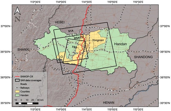 Over the study area, we collected three satellite SAR datasets, and their spatial coverages are presented by the black boxes in Figure 1. The S1A dataset fully covers the SNWD-CR in Handan, while the TSX dataset covers that in Ci County and Handan County, and the RSAT2 dataset covers that in Handan County and Yongnian County. Detailed information about these datasets is listed in Table 1; the RSAT2 and TSX datasets were commercially obtained over a span of only one year. Apart from these two commercial datasets, we also collected 18 Sentinel-1A images, which span from June 2015 to March 2016, to cross-validate results derived from the other two datasets.