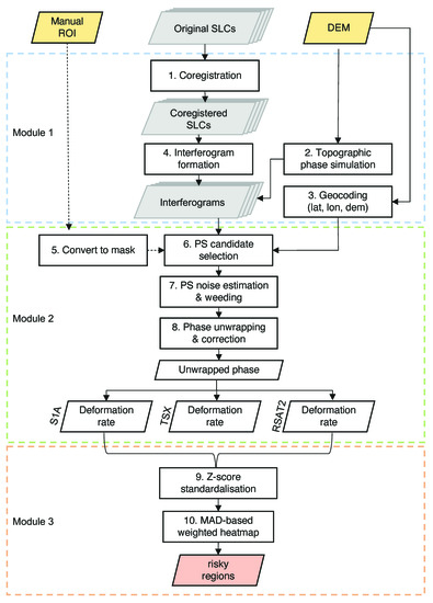 One drawback of the InSAR technique is that it is influence by the phase decorrelation phenomenon, i.e., the phase is incoherent due to changing scattering mechanisms of the target, and the atmospheric effect, i.e., the time delay difference of acquisitions contributes to the atmospheric phase, which is very difficult to detangle from the deformation phase. Two classic methods were proposed to deal with these problems: PS-InSAR and small-baseline subset (SBAS). The former method is used to select pixels with a dominant scattering mechanism, whose phase is stable and whose phase noise is ignorable, allowing for the derivation of more reliable long-time-series displacements [,]. In this method, interferograms are formed with one common reference acquisition. The latter method selects interferograms with short temporal and spatial baselines []; hence, it can deal with datasets with a limited number of acquisitions. In SBAS, multiple reference images are used as reference acquisitions, and resampling of the acquisitions and interferograms is usually needed. Compared to PS-InSAR, which is suitable for urban areas because many artificial targets are permanent scatterers, SBAS is suitable for applications involving rural areas and wide coverage. Since resampling of the original image is carried out during the interferogram formation in SBAS processing, the resolution after resampling is not favourable to reflect the detailed deformation of the SNWDP-CR constructs. Therefore, PS-InSAR is chosen to be applied to the three SAR datasets. PS-InSAR processing encompasses the first two modules shown in Figure 2.