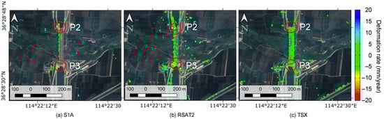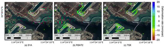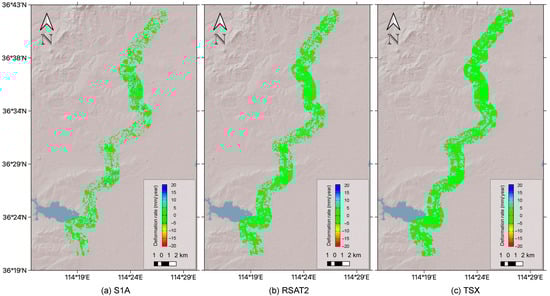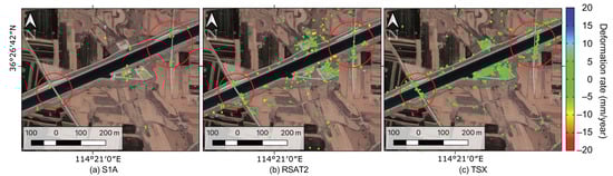 Deformation rate derived from PS-InSAR processing of (a) S1A, (b) RSAT2, and (c) TSX datasets.